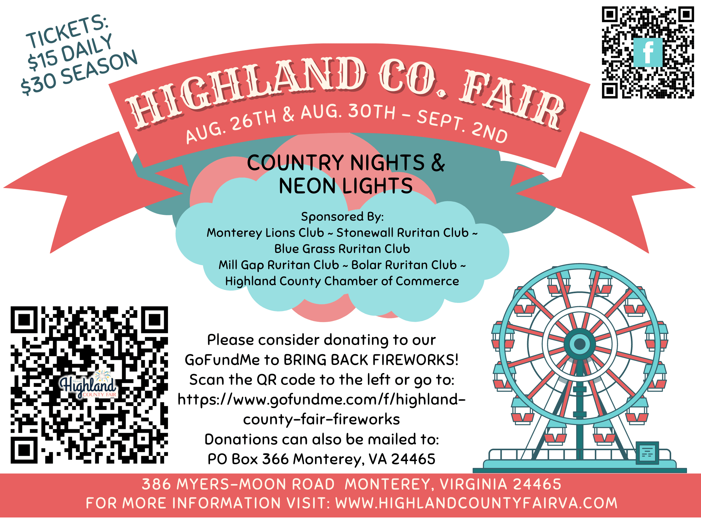 If you'd like to see fireworks return to the fair, please consider making a contribution to the Highland County Fair Association, Inc. at https://gofund.me/072e9ebc If enough money is raised, fireworks will be held on the last night of the Fair, September 2, 2023.