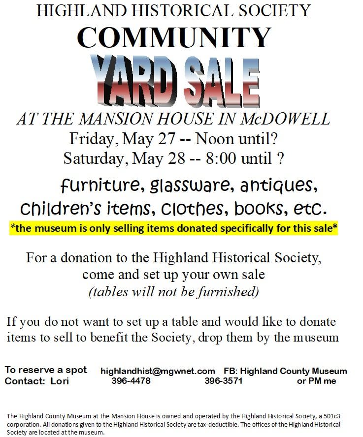 The Highland Historical Society will be holding a Community Yard Sale at the Mansion House in McDowell on Friday, June 3 starting at noon and Saturday, June 4 starting at 8 am.