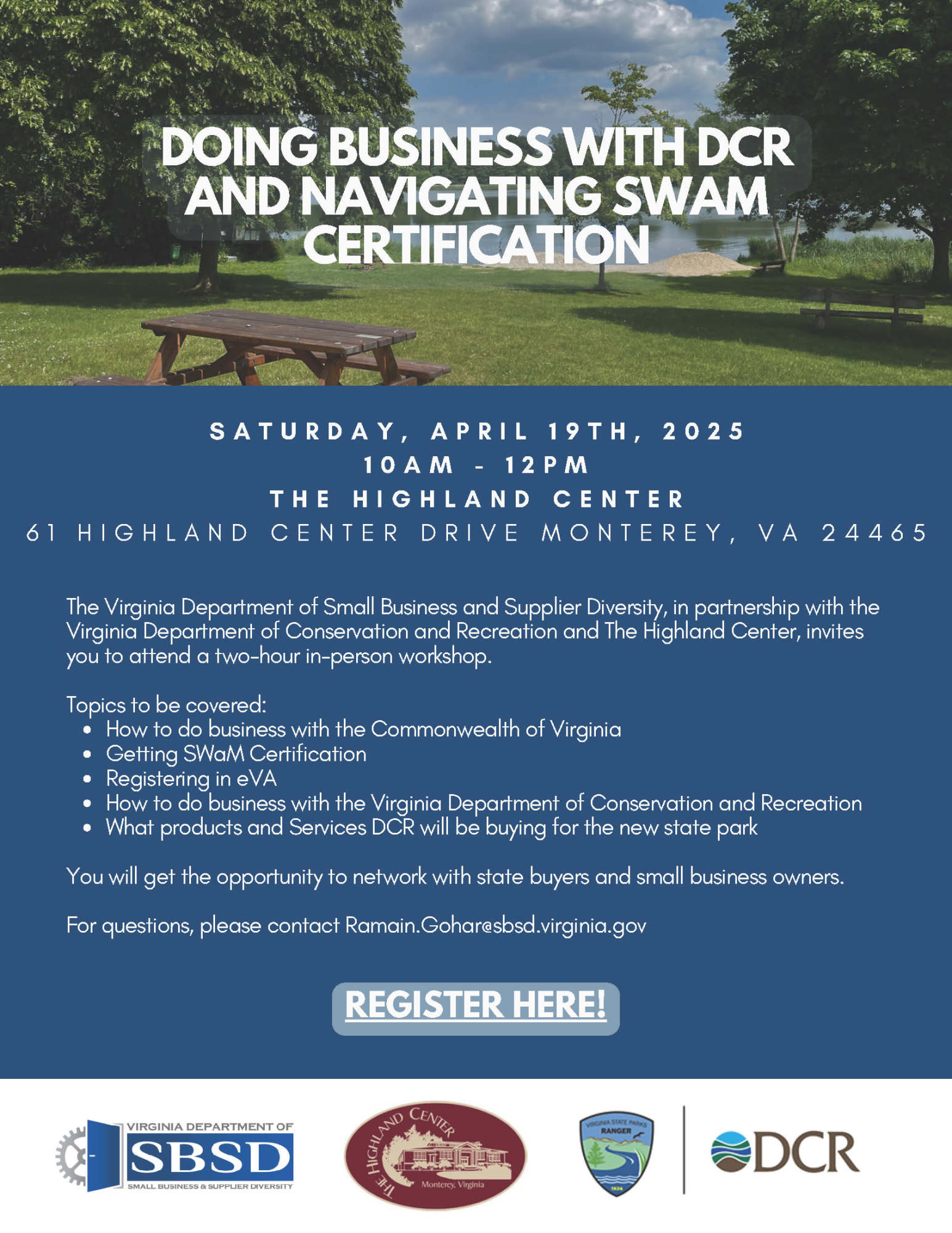 A new state park is coming to Highland County, Virginia in the near future. Learn how you can take advantage by doing business with the Virginia Department of Conservation (DCR)! The Virginia Department of Small Business and Supplier Diversity in Partnership with Virginia Department of Conservation and Recreation and The Highland Center invites you to attend a two-hour in-person workshop on Saturday, April 19th from 10 am – noon at The Highland Center.