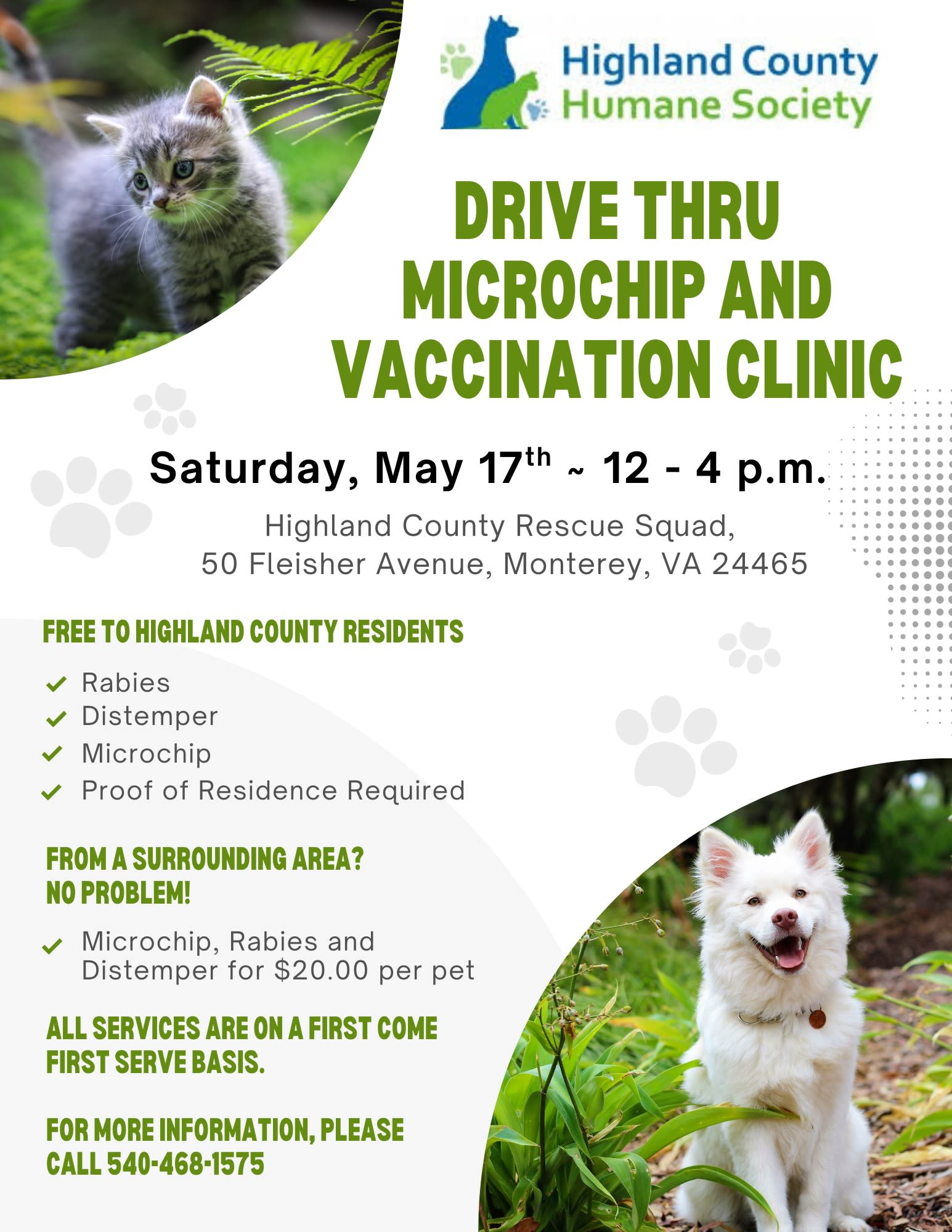 The Highland County Humane Society will hold a Drive Thru Microchip and Vaccination Clinic on Saturday, May 17th from Noon – 4 pm at the Highland County Rescue Squad at 50 Fleisher Avenue in Monterey!