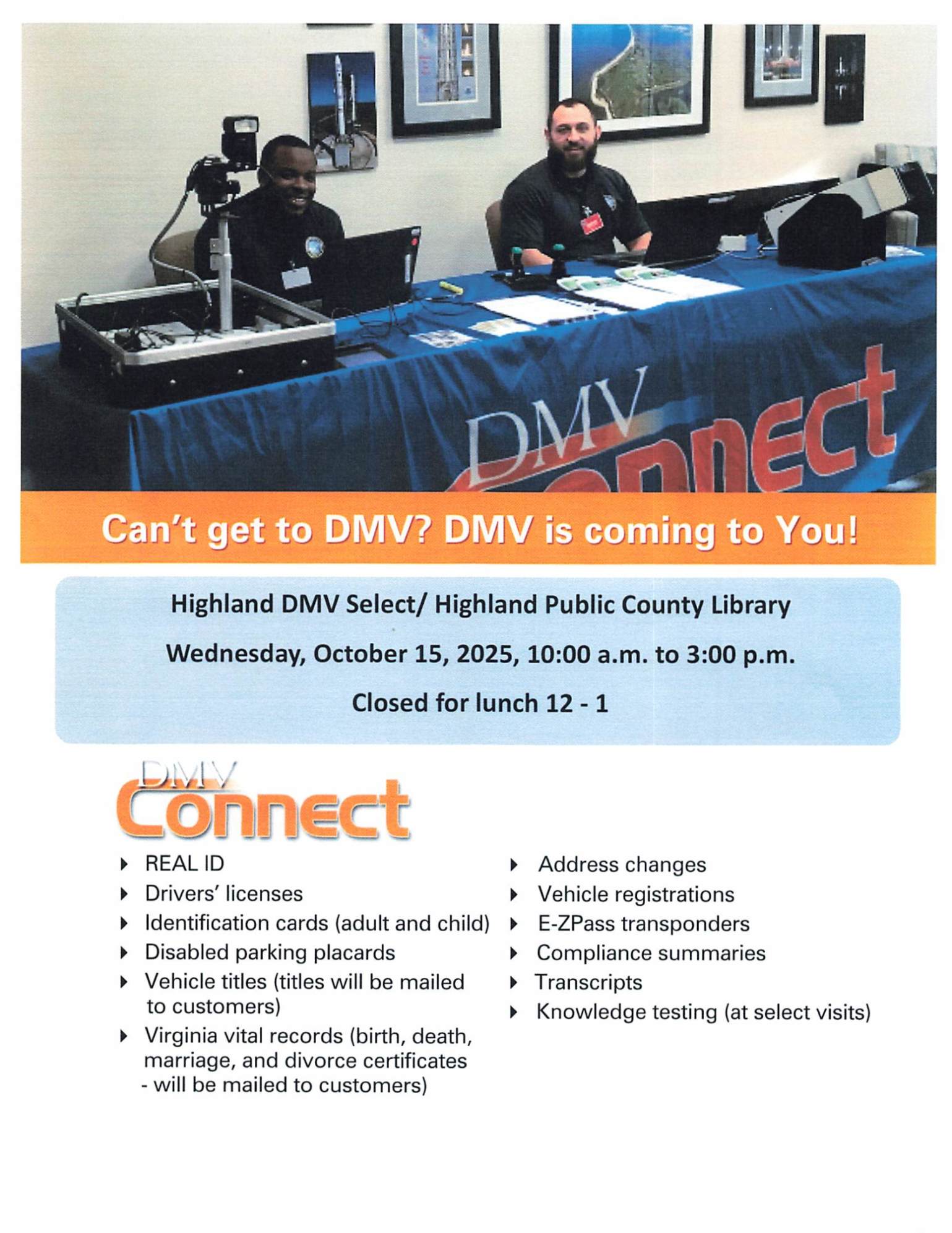 DESCRIPTION:🚐 DMV Connect is Coming to Highland!\n📅 October 15\, 2025\n🕙 10:00 AM   3:00 PM (Closed for lunch from 12:00 PM   1:00 PM)\n📍 Highland County Public Library in MontereySkip the trip to the DMV office DMV Connect brings essential services right to your community!This mobile unit can assist with services that the DMV Select in the Commissioner's office cannot provide\, including:\n✅ Disabled Parking Placards\n✅ REAL ID\n✅ Driver's Licenses\n✅ ID Cards (Adult & Child)\n✅ Birth\, Death\, Marriage & Divorce Certificates (mailed)\n✅ E-ZPass Transponders\n✅ Knowledge Testing (available at select visits) 📣 Don't miss this opportunity to take care of your DMV needs locally and conveniently!